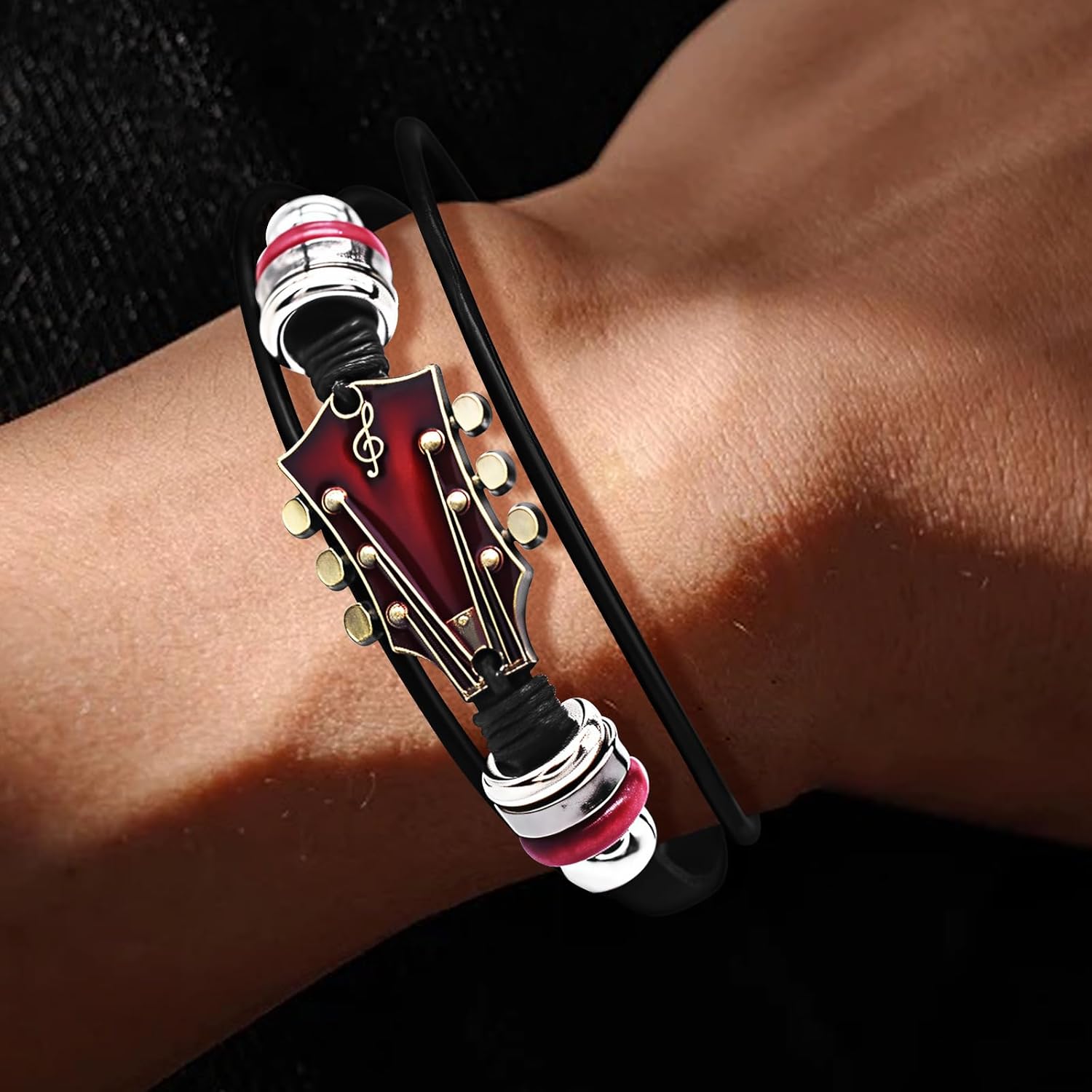Retro Guitar Leather Bracelet for Man Women Unique Bead Braided Handmade Ethnic Tribal Cuff Multi-Layer Cords Wrap Music Shape Punk Rock Jewelry Gifts Wristband